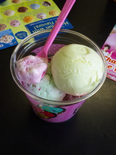 今日のお昼 Category:日々のこと Date:2009年06月07日 31のアイスクリーム(チャレンジ・ザ・トリプル!)と、フルーツグラノーラクッキー。いつも注文した順番通りに盛りつけてくれるので、ロッキーロード、マスクメロン、ポッピングシャワーと頼んだのに、メロンが上に来ちゃってました。ポッピングシャワーを上にして、柄ものと柄ものの間に無地を挟みたかったの。ちっちゃいこだわりだけど、アイスクリームは配色が肝心だと思うのです。味もまあ大事だけれども、見た目のかわいさが重要。トップスとボトムスにインパクトのあるアイテムをチョイスしたら、インナーは無地ベーシックにしたい!本当はダイキュリーアイス、マスクメロン、ポッピングシャワーで青系コーディネートにしたかったのに、ダイキュリーはまだ発売してないんですって。6、7月ってメニューに書いてあったのに……しょんぼり。代わりを選んでくださいと言われて、咄嗟に頼んでしまった割には、冷静にチョコレート系のロッキーロードを一番下に配置しているわたし。チョコレート系は上にしておくと溶けて全員チョコレート味になっちゃうからね。ちなみにダブルのときは、濃い柄ものと、無地のシャーベットが一番美味しく味わえると思う。でも見た目としてはカラーものと白地の柄ものが一番しっくりくる。イチゴ×チョコは間違いないけど定番すぎて飽きがくるのよ。そこは敢えてオレンジとか合わせて……アイスクリーム大好きですみません。
